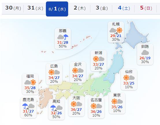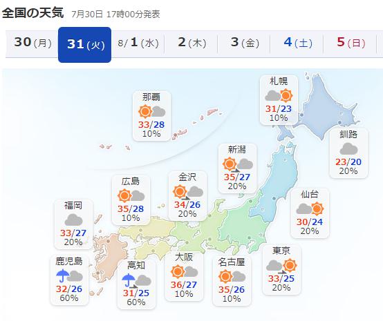 火星最接近の7月31日の天気予報は、全国的に雲と晴れ。