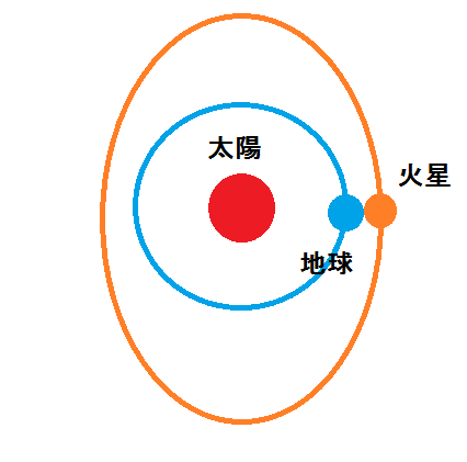 ただ、地球は太陽の周りを一定距離を保ったまま、まん丸く回っていくのに対し、火星は楕円形に回っていきます。