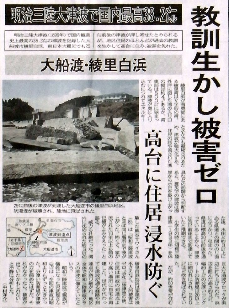 もちろん綾里地区にも25メートル前後の津波が押し寄せたとみられるようですが、地区住民の方々は、ほとんどが過去の教訓を生かして高台に住み、被害を免れていらっしゃいます。