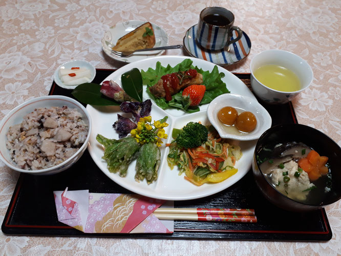 こちらは定食の一例ですが、菜の花が盛り付けてあるので、ちょうど今頃ですね。